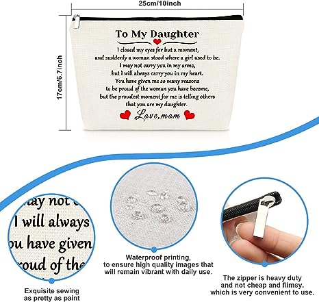 - Memorable Gift: The Daughter Cosmetic Set makes for an unforgettable present your daughter will treasure for years to come. Every time she applies her makeup, she’ll reminisce about the joy and love you shared.